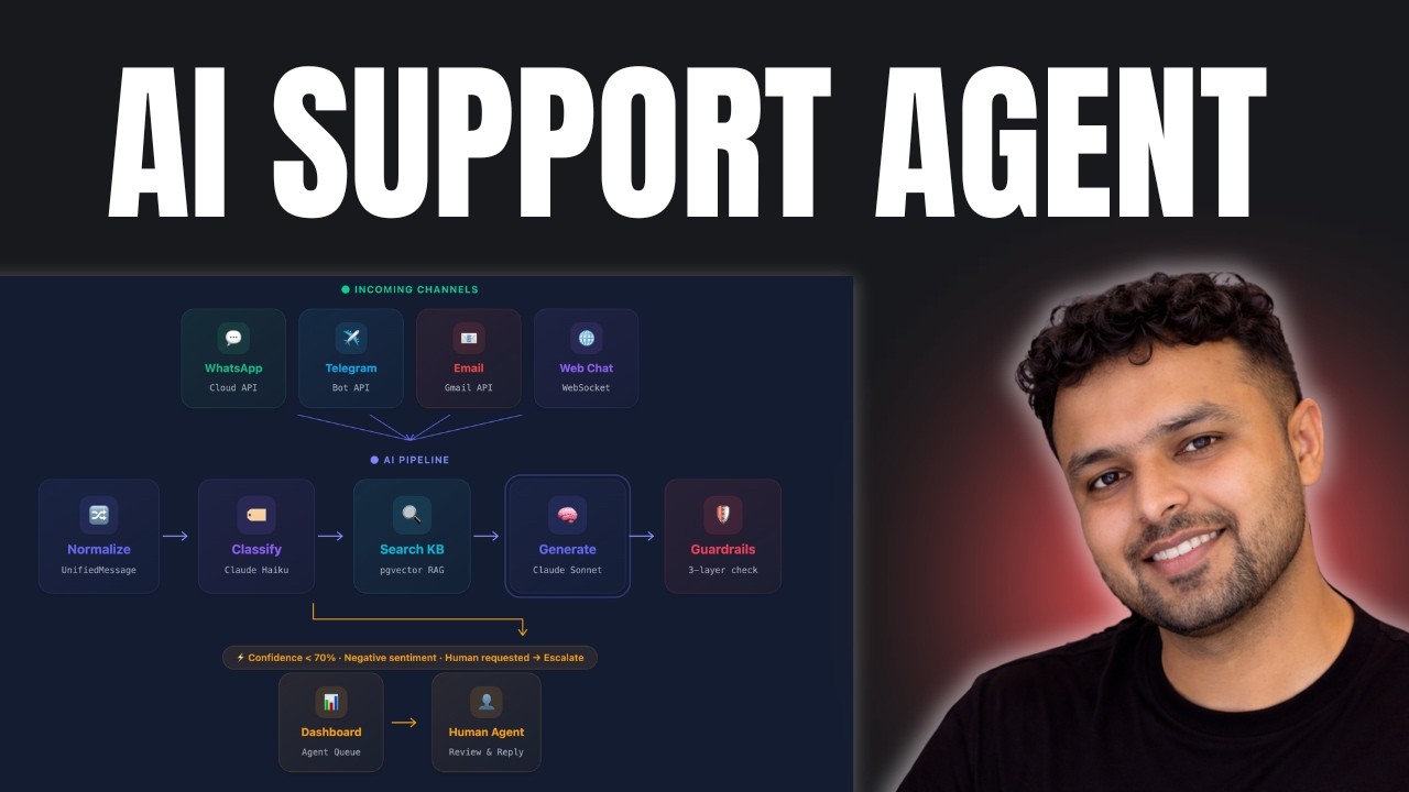 Build a complete multi-channel AI customer support agent using Claude Code. Handles WhatsApp, Email, and Web Chat with RAG knowledge base, dual-model AI (Claude Haiku for classification, Claude Sonnet for responses), 3-layer anti-hallucination guardrails, and smart escalation. Replaces a 3-person support team for $85/mo.