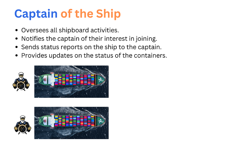 Every cargo ship has a captain who ensures the ship runs smoothly, follows its planned course, and handles any issues that arise during the journey. In Kubernetes, the kubelet acts like the ship’s captain. It’s an agent that runs on each worker node, making sure that the containers (pods) assigned to that node are running as expected. The kubelet communicates with the master node to report the status of the node and the pods running on it.